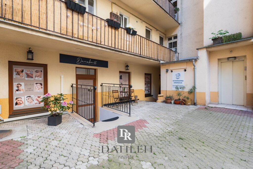 Dispozične je priestor veľmi prakticky riešený – pozostáva zo vstupnej recepcie, samostatnej miestnosti vhodnej napríklad pre kadernícke služby, ďalšej oddelenej miestnosti, WC a odkladacieho priestoru. Veľkým benefitom je aj prístup na nádvorie, ktoré poskytuje príjemné zázemie pre zamestnancov aj klientov a zároveň zabezpečuje intimitu pracovného prostredia.